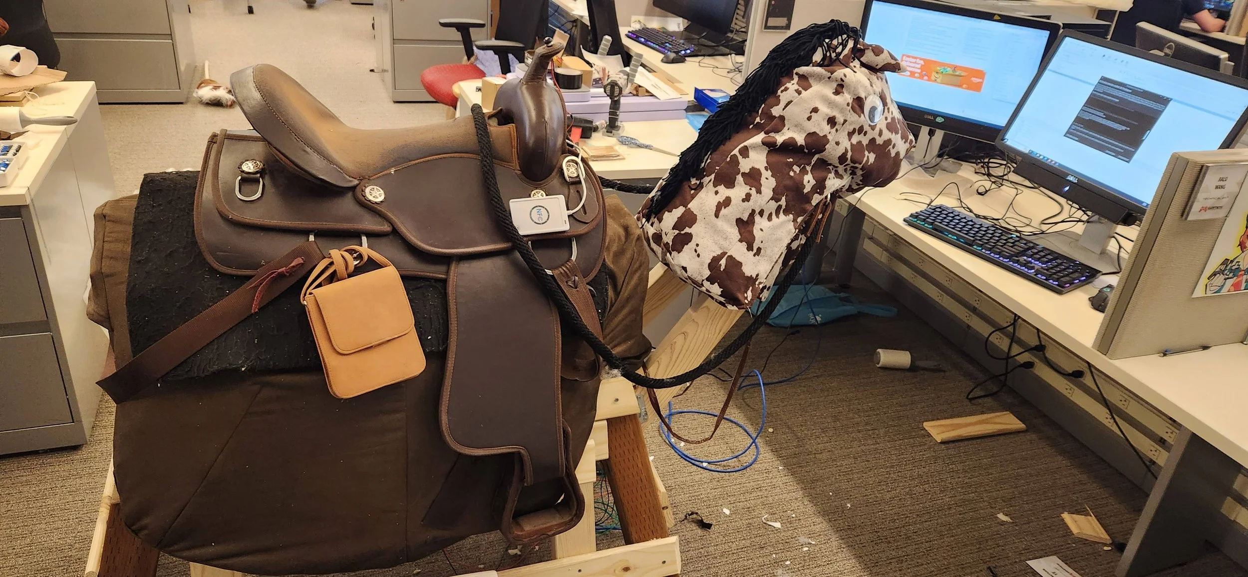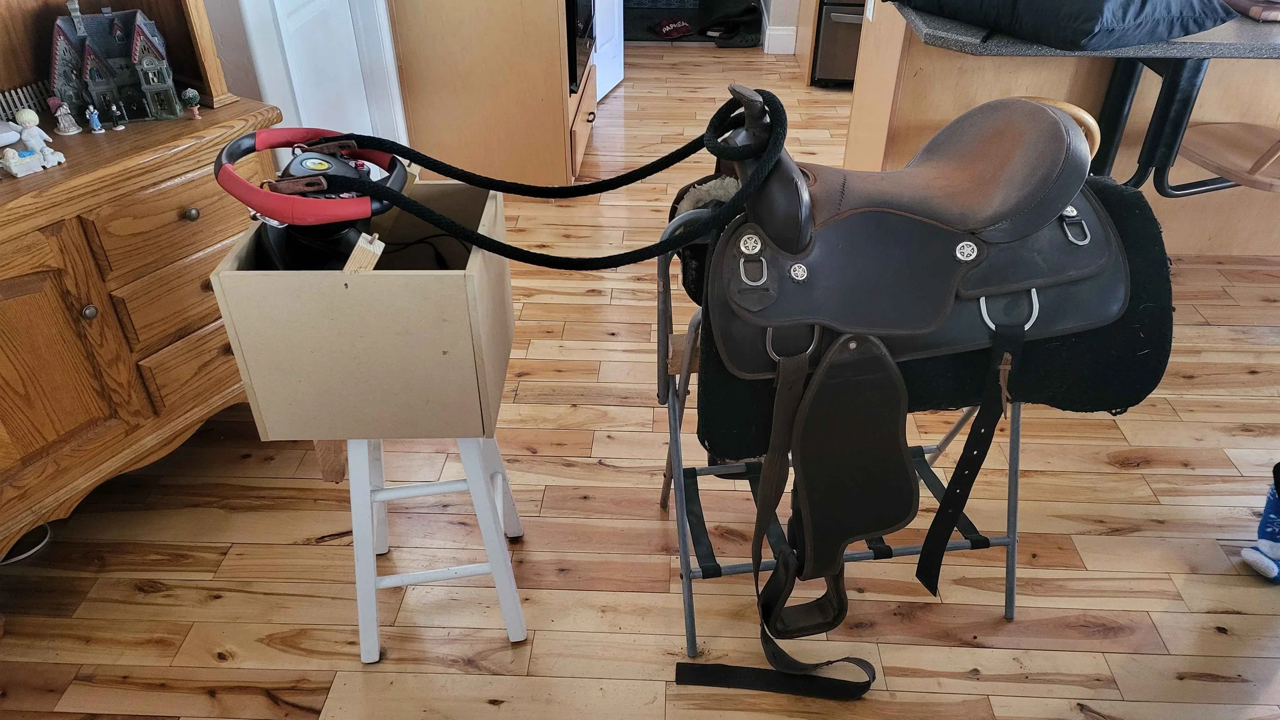Although you don't need to play the game using the H.O.R.S.E., everything was designed around it. Our goal for this project was to design and create a game whose main method of control was through an alternative controller. Our initial prototype was an Xbox 360 racing wheel hooked up to actual horse reins. The way it hooked up made hitting the side triggers and turning really easy. We placed it in a custom wooden box we made to hold it and tied it down with 20-pound dumbbells. We ended up using the same saddle and mat the entire process. We ended up making a wooden version of the metal stand from the prototype, and we made it much bigger to feel more like a real horse. A team member sewed the horse head together that just fit over the wooden head we made that basically took the spot of the racing wheel. We added collapsable wheels to the feet to make it easier to move, luckily someone on the team had a truck so it was easier to move around the city than we thought.