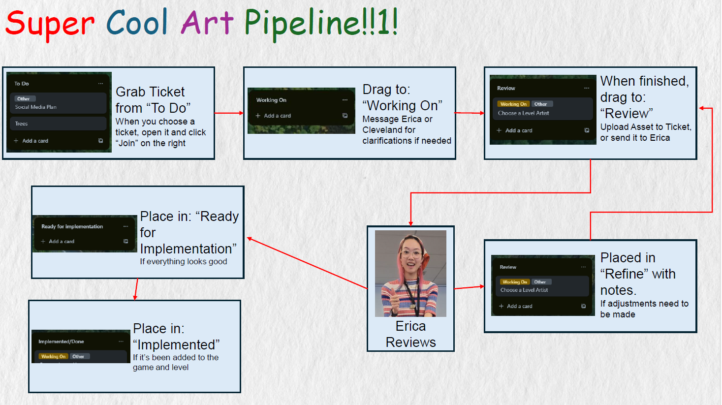 Cleveland and I implemented an art pipeline on Miro that the lead artist was able to easily check and validate the teams progress.